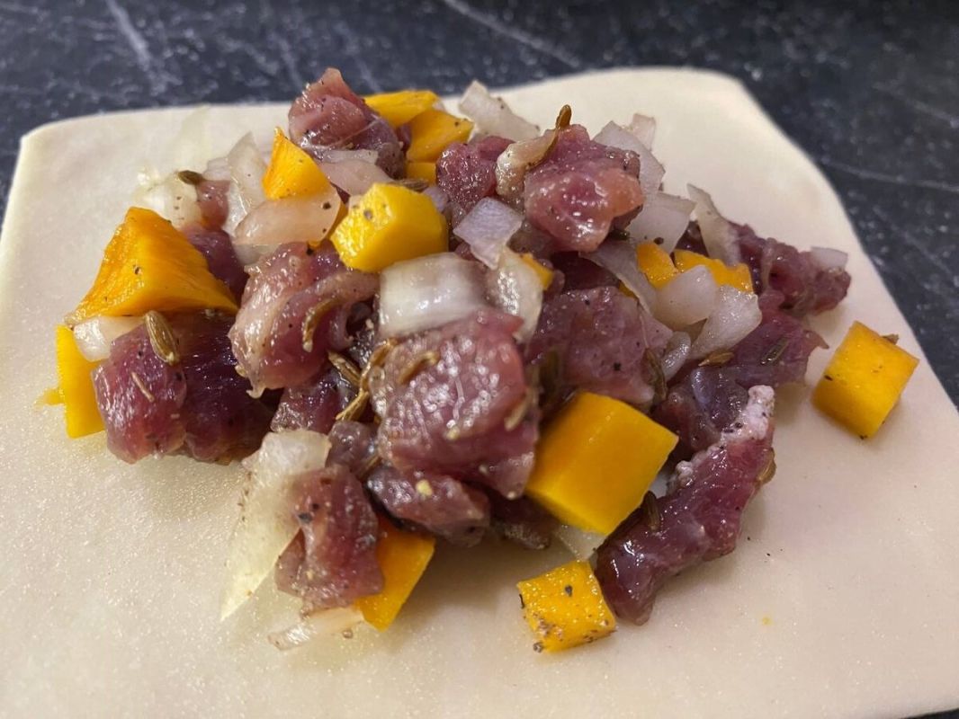 Чтобы начинка была сбалансированной, мясо, лук и тыква необходимо нарезать на мелкие кубики размеров 0,3—0,5 см. Смешайте их вместе и добавьте специи — это придаст начинке неповторимый вкус. На эту начинку пьется не только соль и перец, но и зира, хотя к ней стоит подходить с осторожностью, так как не всем нравится её аромат.