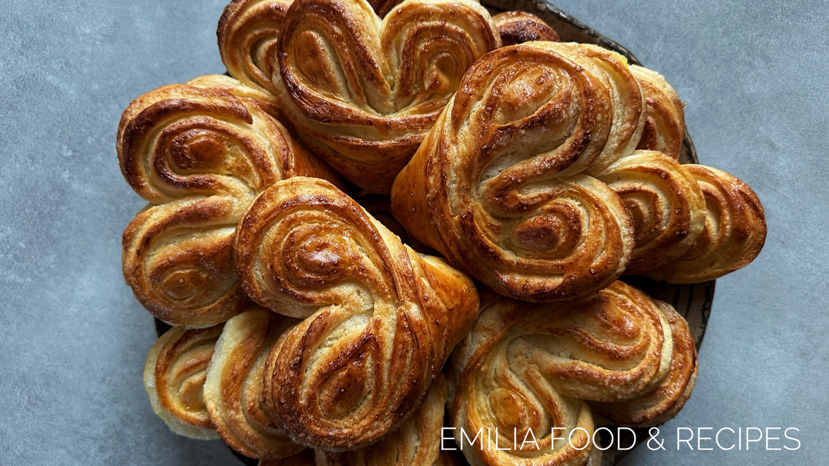 Каждую часть раскатываем в круг толщиной около 3 мм, обильно смазываем маслом и притрушиваем сахаром. Сворачиваем в трубочку и формируем сердечко, складывая пополам. Сразу укладываем на противень с пергаментом, предварительно накрывая их полотенцем, чтобы избежать прилипания.