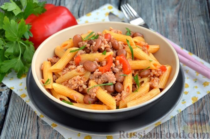 - Макароны с фаршем и фасолью — простое, быстрое и сытное блюдо, которое прекрасно украсит любой стол. Консервированная фасоль добавит цвет и текстуру, а сладкий перец добавляет очарования.