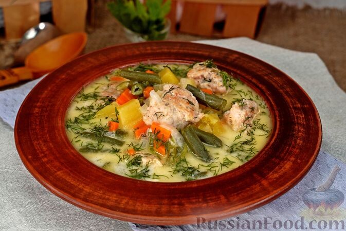 - Суп с фрикадельками, стручковой фасолью и плавленым сыром — идеальное сочетание нежных фрикаделек и сливочного сыра!