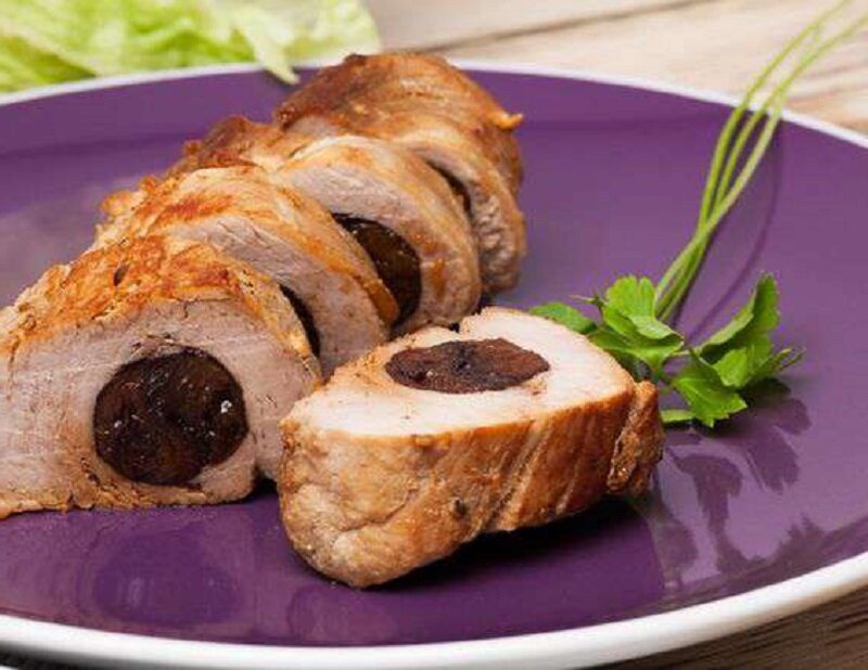 Тем временем чернослив следует промыть, а затем аккуратно разложить вдоль свинины в плотный ряд. После этого мясо аккуратно сворачивается в рулет и связывается кулинарной нитью. Рулеты помещаются в пакет для запекания, где добавляется 0,3 стакана воды. Пакет плотнo закрывается и помещается на противень. При желании можно добавить половинки луковицы.