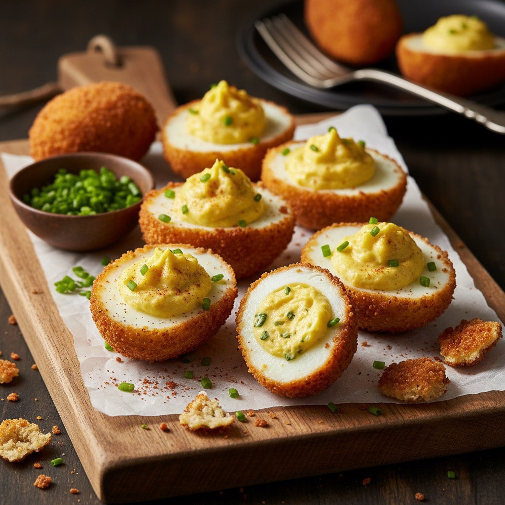 Подавайте фаршированные яйца в панировке горячими, украсив зеленью и предложив различные соусы. Это блюдо станет настоящей звездой вашего стола, радуя гостей своими хрустящими и нежными нотками!