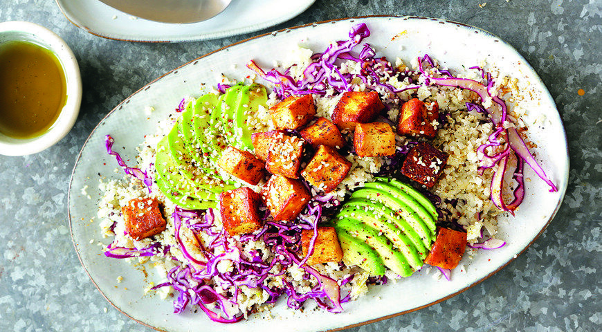 Обжарьте кунжут: Вылейте семена на сухую сковороду и обжаривайте, постоянно помешивая, до золотистого цвета, примерно 2 минуты. Затем переложите на тарелку и дайте охладиться.Подготовьте тофу: Нарежьте его кубиками, полейте половиной соевого соуса и дайте настояться 5 минут. Нагрейте 1 столовую ложку масла на сковороде и обжарьте тофу до хрустящей корочки, около 3 минут.Приготовьте овощи: Тщательно вымойте лайм и натрите его цедру. Из мякоти выжмите сок. Разделите цветную капусту на соцветия и измельчите их в блендере до консистенции, похожей на рис. Красную капусту нашинкуйте.Добавьте авокадо: Разрежьте его пополам и удалите косточку. Нарежьте мякоть ломтиками и сбрызните соком лайма, чтобы она не потемнела.Соберите салат: В одной миске соедините оставшееся масло, соевый соус, сок и цедру лайма, приправьте перцем и хорошо перемешайте. В большой салатник выкладывайте сначала цветную капусту, затем красную капусту, тофу и авокадо. Полейте заправкой и посыпьте обжаренным кунжутом. Подавайте немедленно.Этот салат не только порадует вас своими вкусовыми сочетаниями, но и сделает стол ярче! Попробуйте и откройте для себя новые горизонты вкуса.