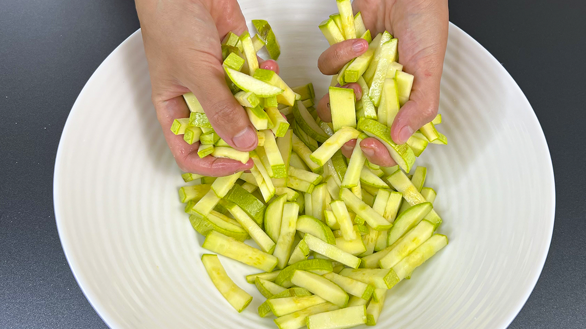 1. Начиная готовить, нарежьте кабачок небольшими кусочками и посолите, оставив на 15 минут для выделения жидкости.
