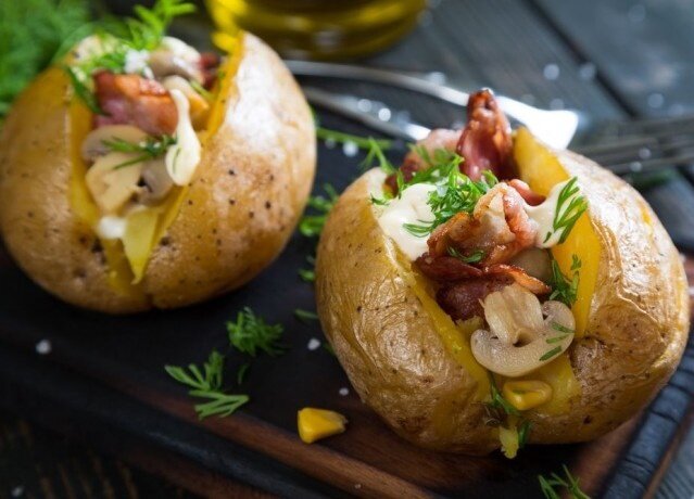 Когда картофель готов, разрезать каждую картофелину вдоль до середины, добавить соль и перец по вкусу. В центр каждой картошки поместить чайную ложку сметаны, немного кукурузы, а сверху выложить смесь из грибов и бекона, посыпав всё мелко нарезанным укропом.
