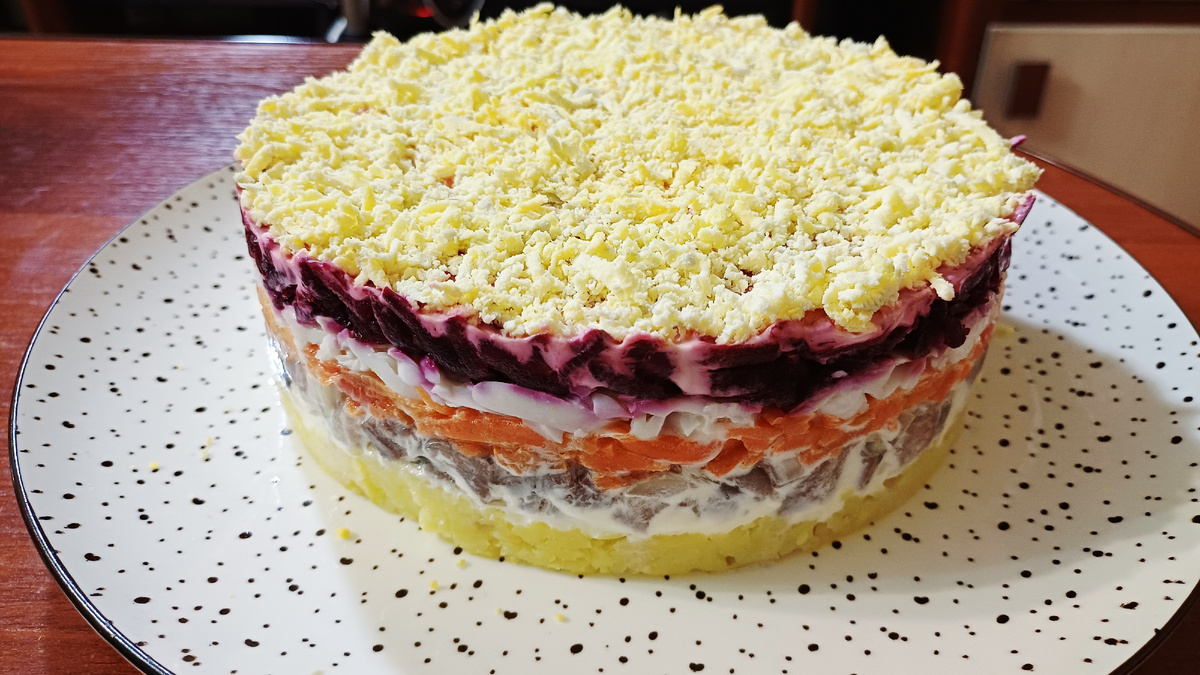 Далее в игру вступает свекла: два сваренных корнеплода натираются на крупной терке и укладываются в качестве очередного слоя, вновь с майонезом. Завершает композицию — желтки от трёх яиц, потертые на мелкой терке. Это последний штрих, который придаст блюду насыщенный цвет и невероятный вкус.