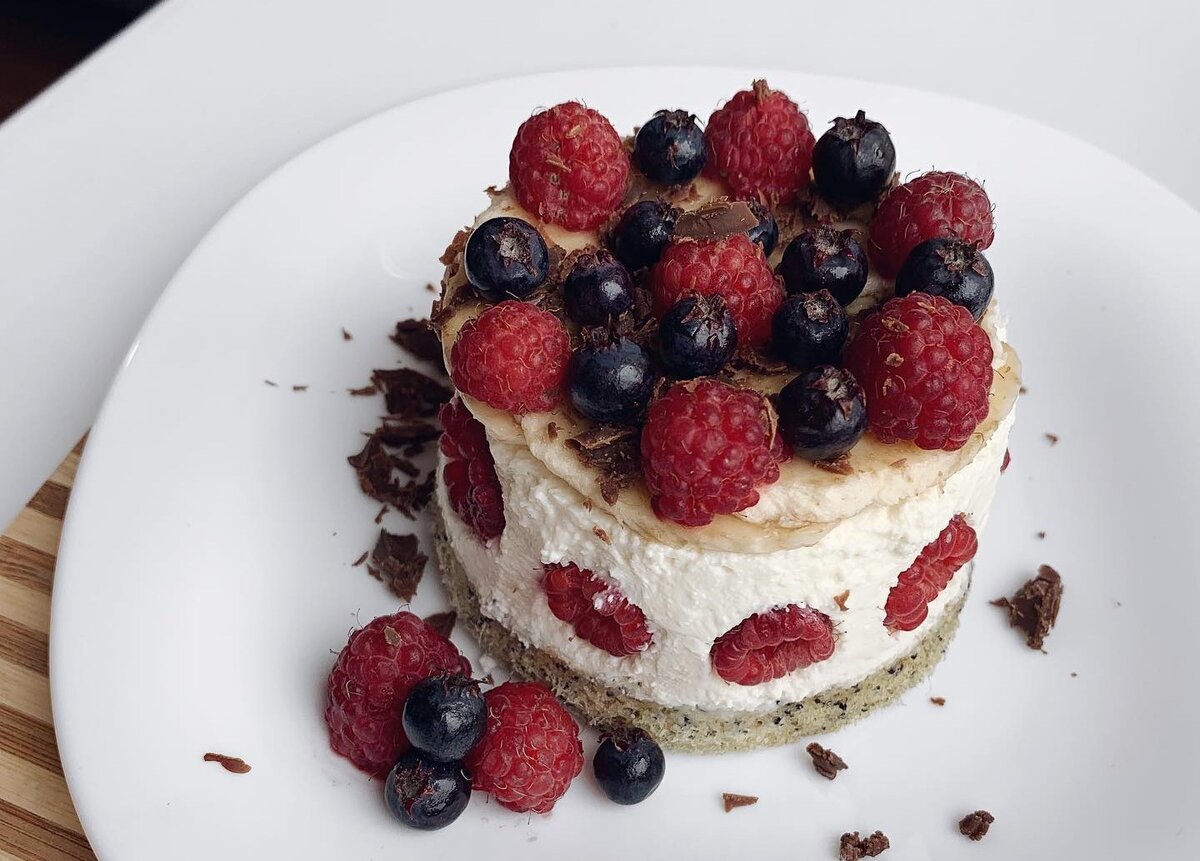 Самая интересная часть — это сборка десерта! На одну основу бисквита нанесите щедрый слой творожного крема, затем повторите операцию с другой основой. Украсьте десерт по своему вкусу: свежей малиной, черникой или бананом. Для сладкого акцента добавьте немного безсахарного шоколада.