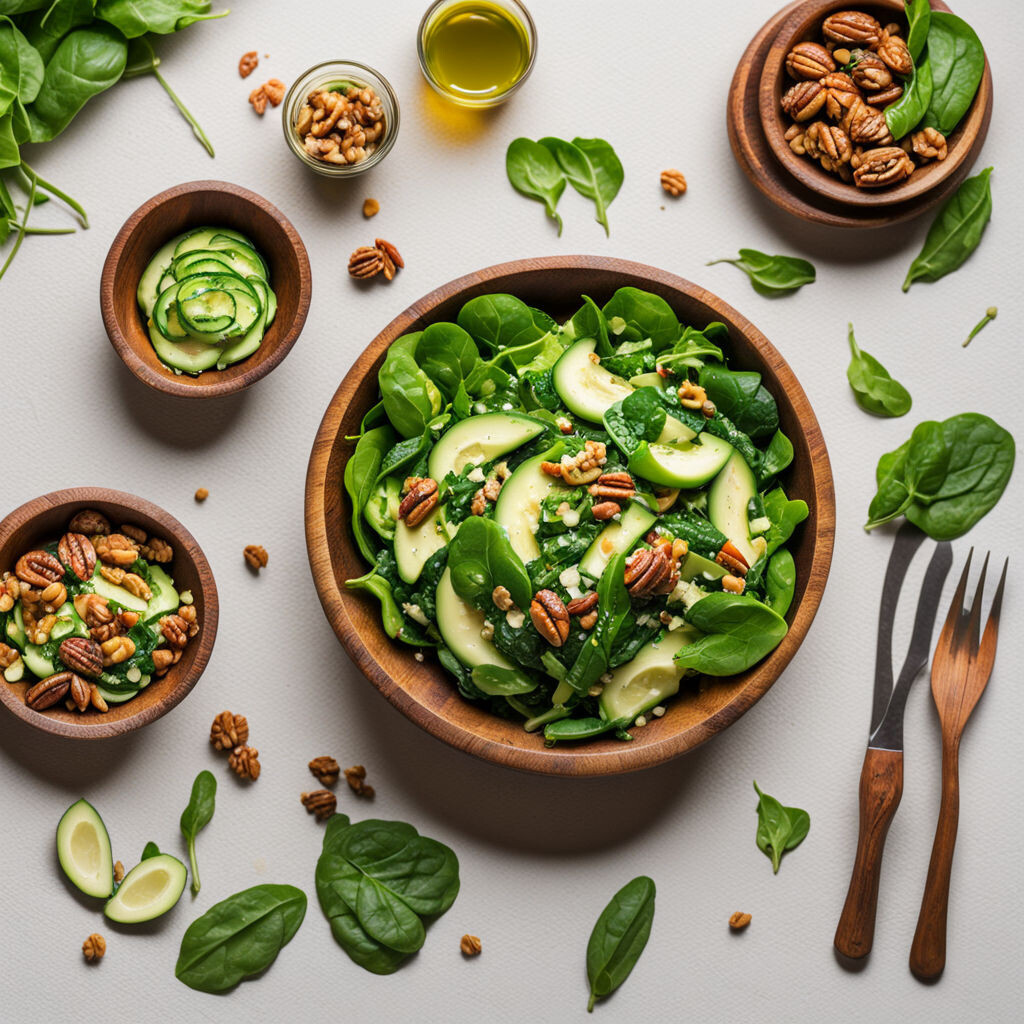 Приготовление: Для начала промойте шпинат и нарежьте огурец с авокадо. Затем поджарьте грецкие орехи для аромата и все соедините. Заправьте оливковым маслом с лимонным соком и перемешайте.