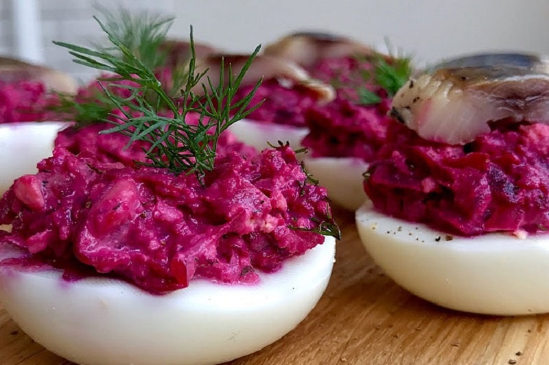 После маринования сливаем жидкость и очищаем яйца, отделяя желтки. Свеклу натираем на терке, добавляем к ней щепотку соли, майонез и немного масла.