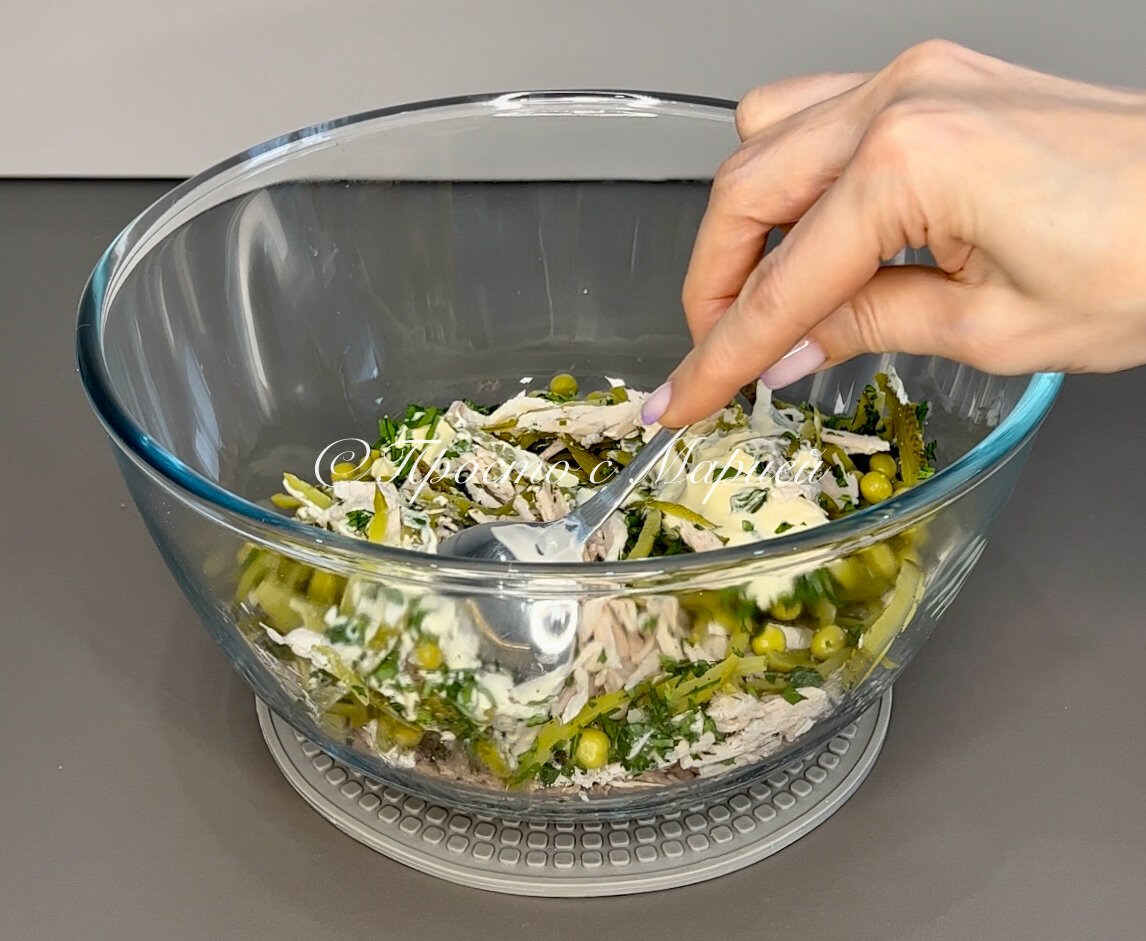 - Огурцы нарезаем также соломкой, после чего необходимо добавить мелко нарезанную петрушку. Посолите, поперчите на свой вкус и заправьте майонезом.