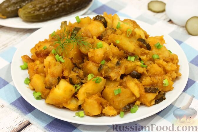Тушеная картошка с маринованными огурцами: Один из самых популярных способов приготовления картофеля — тушение. В этом варианте картошка готовится с маринованными огурцами и томатной пастой, что придает блюду просто фантастический вкус и делает его сытным и экономичным.