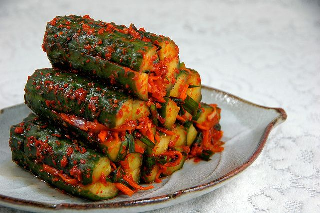 Зеленый лук, в идеале, следует нарезать тонкими полосками под углом примерно в один сантиметр. Смешайте его с морковью по-корейски, взяв в соотношении 1 к 3 — на килограмм огурцов добавьте около 300 граммов моркови.
