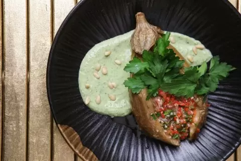 В столичном кафе Hydra Bar светило израильской кулинарии Александр Марон создал настоящие шедевры. Он привнес в меню вдохновение Тель-Авива, и запеченный баклажан стал настоящей звездой. Его мягкая мякоть отлично контрастирует с сочной томатной сальсой, в которой присутствуют чеснок и свежие овощи. Завершает эту вкусовую симфонию насыщенный соус тхина, обогащенный разнообразной зеленью. Этот терпкий соус, напомнящий несладкую кунжутную халву, великолепно дополняет как свежие, так и запеченные овощи.