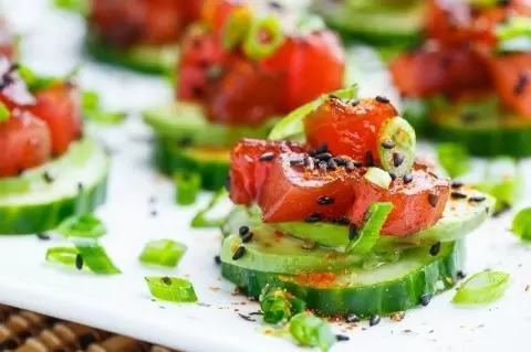 3. На каждый кружок огурца выложить немного авокадо, сверху добавить смесь тунца с приправами. Подавайте немедленно, чтобы насладиться свежестью блюда!