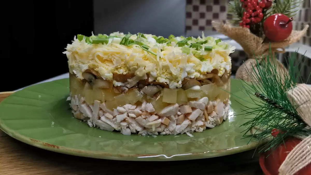 При приготовлении важно не просто нарезать ингредиенты, но и правильно компоновать их слой за слоем. Начинайте с куриного слоя, затем добавьте ананасы, грибы, яйца и сыр. Каждый слой слегка утрамбовывается и покрывается сеточкой из майонеза, что делает салат более сочным и аппетитным. На финал посыпьте его свежим зеленым луком для яркости и легкой остроты.