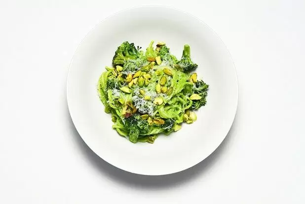В одной кастрюле отварить спагетти, а в другой - брокколи.Для приготовления песто в блендер поместить половину отваренной брокколи, добавить оливковое масло, половину тертого пармезана и половину фисташек. Включить блендер и довести массу до однородной консистенции, добавив лимонную цедру и сок. Приправьте по вкусу солью и перцем. При необходимости добавьте немного воды для облегчения смешивания.К спагетти добавить оставшуюся брокколи и приготовленный песто. Перемешать и посыпать оставшимися пармезаном и фисташками перед подачей на стол.