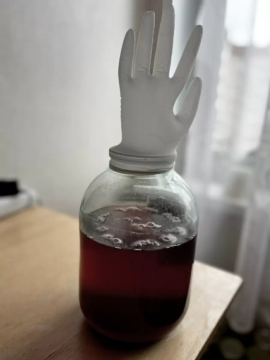 – Раздавить черешню и смешать её с декстрозой, изюмом и водой в банке.