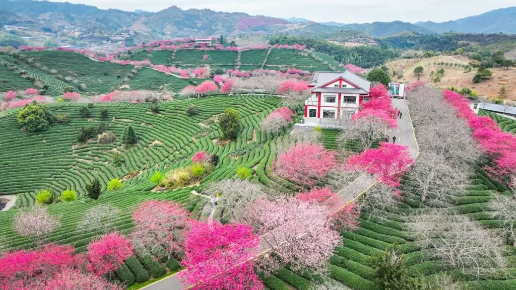 С приходом весны в Китае зацвели вишни и сливы, что знаменует начало сезона публикаций о красочных чайных плантациях. Особенно красивые пейзажи можно увидеть в районах Фуцзяни и Юнфу. Эти места заслуженно называют материковым Алишанем, где с 2008 года трудится тайваньский фермер, специализирующийся на улунах. Сотни тысяч цветущих деревьев превращают ландшафт в сказку, а новый розовый поезд, курсирующий среди зелени и цветущих вишен, лишь добавляет красок. Вполне возможно, что поезд предлагает и чайные дегустации — это было бы настоящим изысканным удовольствием.