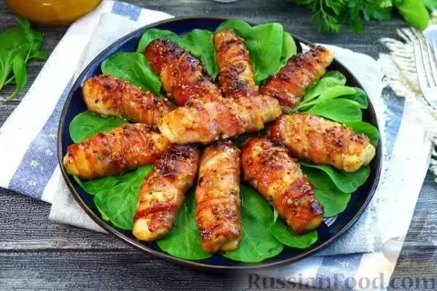 - Куриные рулетики в беконе — нежные кусочки куриного филе, завёрнутые в хрустящий бекон, создают идеальное сочетание. Чтобы добавить изюминку, их можно покрыть медово-горчичной глазурью, что придаст блюду сладко-пряный вкус. Приготовление занимает всего несколько минут, а результат радует всех!