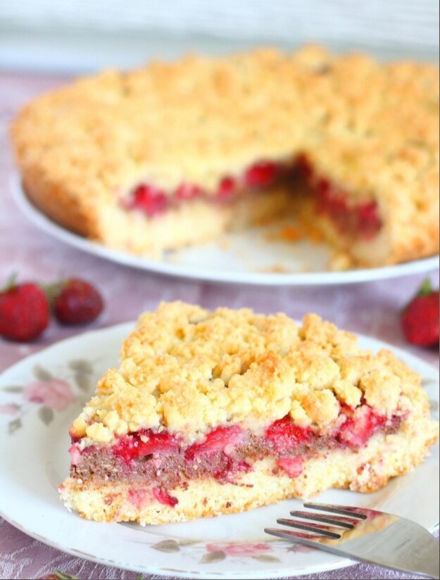 На тесто ровным слоем выложить творожную начинку и клубнику. Сверху посыпать оставшейся крошкой.
