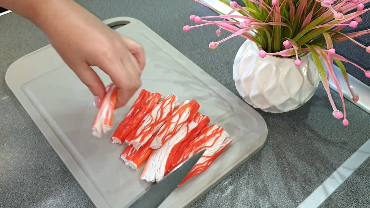 Крабовые палочки должны быть охлажденными. Они должны легко разжиматься руками или с помощью плоской стороны ножа. Каждую палочку следует нарезать на три части, при этом не нужно разъединять волокна. Все это отправляют в глубокий салатник.