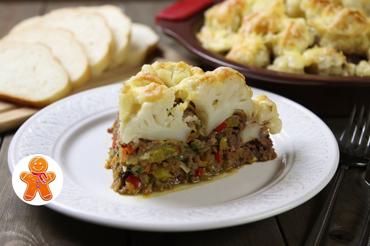 Собрать запеканку можно в форме горки, используя слоями обжаренные овощи и мясные блинчики из фарша. На дно формы для запекания выложить немного овощной смеси и сверху разместить мясную лепешку. Не забывайте добавлять тертый сыр и другой ингредиенты по желанию. На верхушку укладывается цветная капуста, придающая блюду оригинального вида.