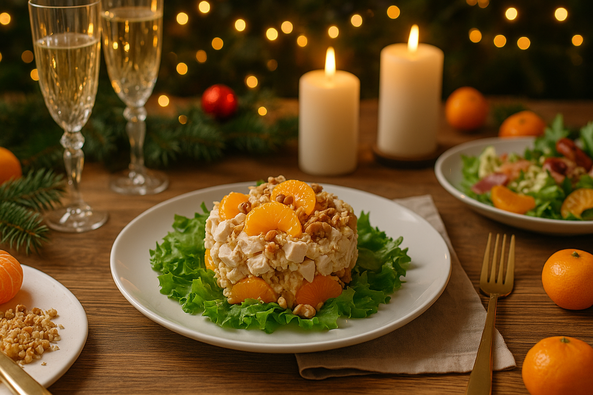 Когда на улице мороз, а на столе разгорается яркий и сочный салат, настроение поднимается сразу. Мандарины вносят в блюдо сладкую свежесть, курица — сытность, а грецкие орехи добавляют хруст. Этот салат служит не только вкусом, но и эмоциями, отображая атмосферу праздника.