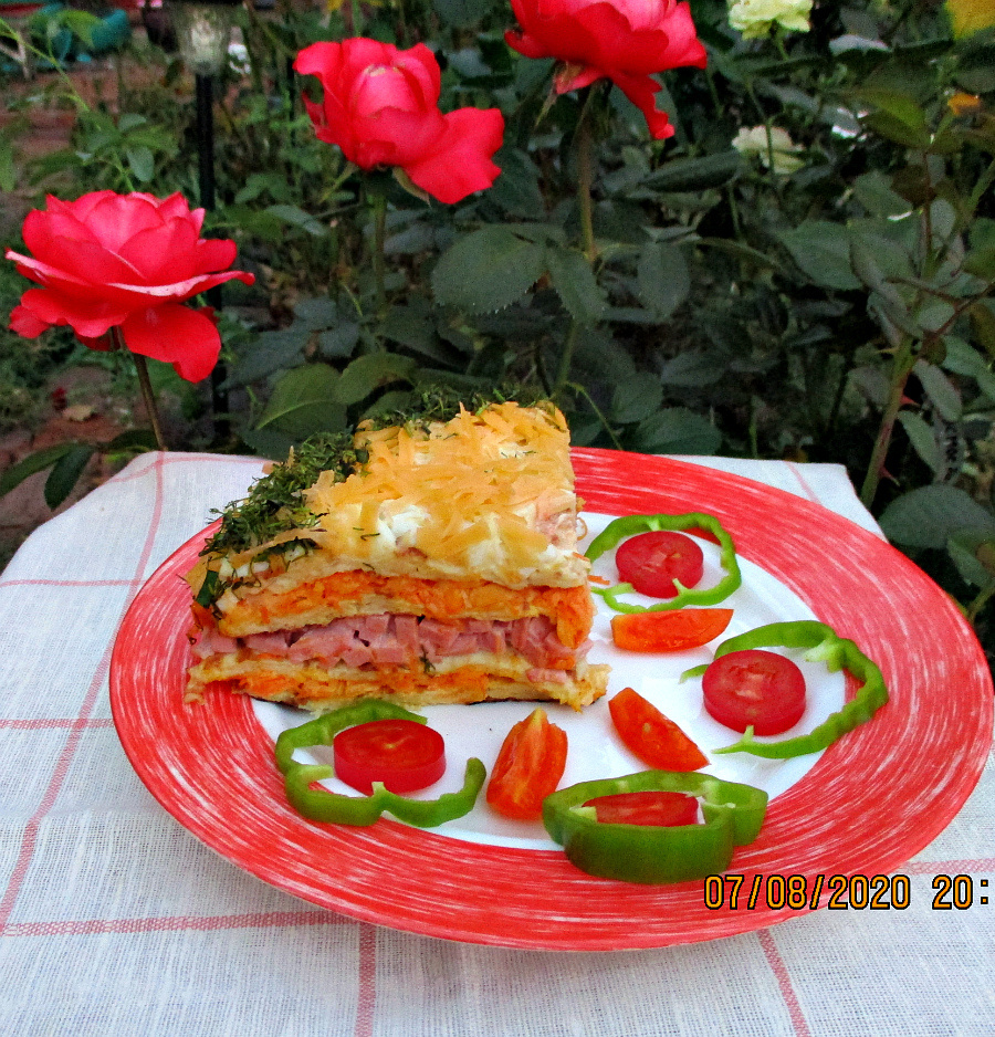 Остуженные лепешки собирайте поочередно: первый блин, первая начинка с морковью и сыром, затем второй блин с начинкой из ветчины. На третий блин кладём массу из моркови, снова сыр, а на последний — яйца, посыпая сверху сыром и зеленью для красоты.