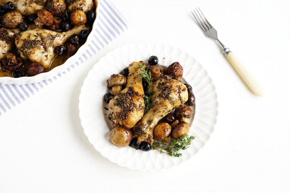 С маслин слейте жидкость и уложите их поверх курицы и грибов. Не забудьте про тимьян — он добавит блюду аромата.