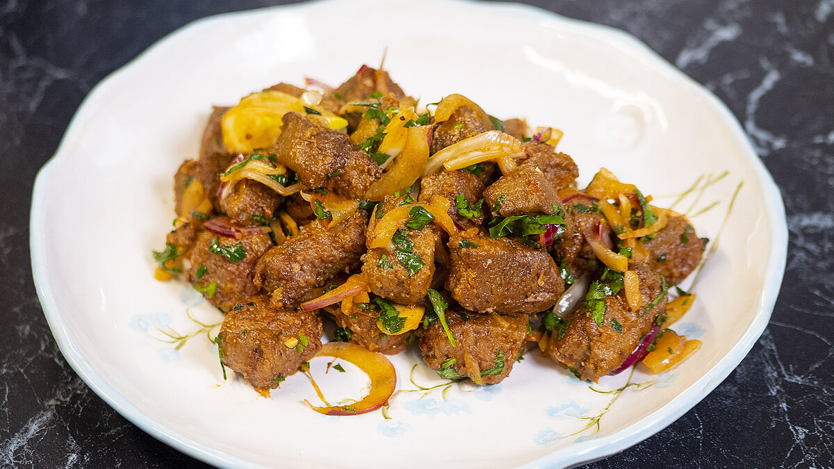 Сначала необходимо тщательно промыть говяжью печень и удалить пленки. Далее нарежьте ее на небольшие кубики. В глубокой миске обваляйте печень в муке, чтобы каждый кусочек был равномерно покрыт. Лук нарежьте тонкими полукольцами, а петрушку мелко нашинкуйте. Соедините лук с петрушкой, посолите и добавьте сок лимона. Заправьте смесь специями по вкусу.