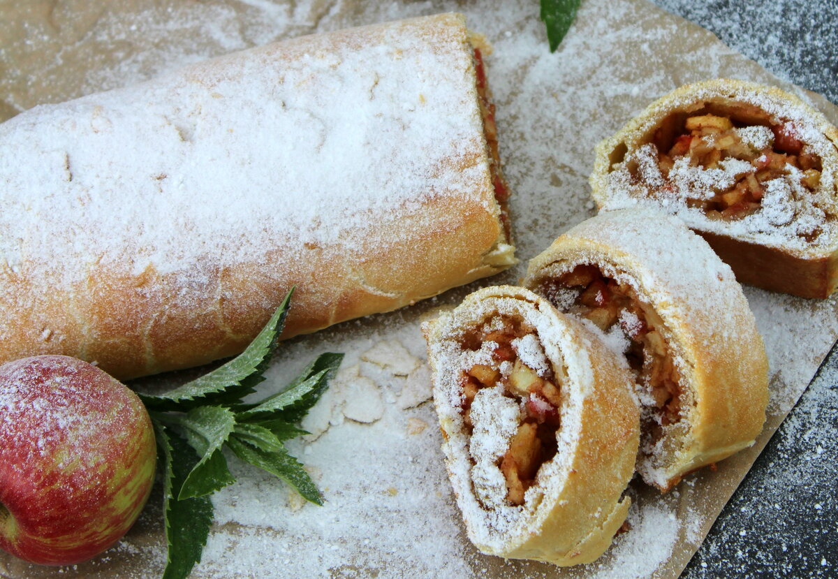 Для раскатки теста потребуется большой стол, застеленный мукой. Разомните тесто и начните его растягивать. Оно должно быть тонким и почти прозрачным. После этого нарезаем начинку, укладываем её на тесто, сворачиваем в рулет и помещаем на противень. Запекайте в разогретой духовке около 20-25 минут, пока не появится золотистая корочка. Подавайте горячим, посыпанным сахарной пудрой.