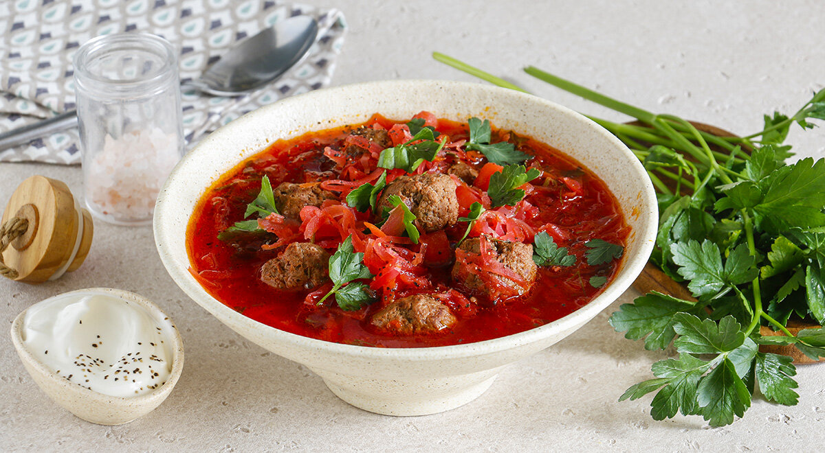 Такой борщ будет замечательно сочетаться со сметаной и свежей зеленью. Его можно варить не только из говядины, но и из свинины, или создавать универсальные фрикадельки из смеси мясных фаршей.