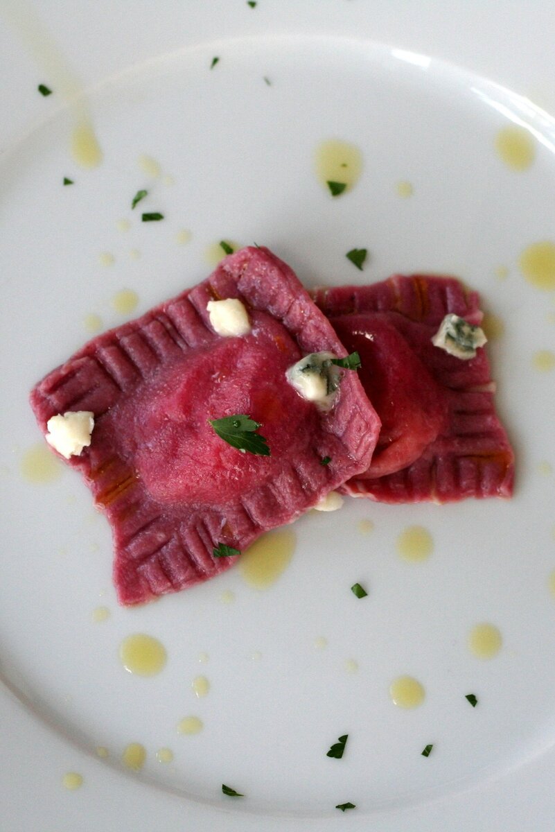Сначала отварите свеклу до готовности и полученное пюре взбейте с помощью блендера или пропустите через сито. Параллельно просейте обе муки и соедините их с щепоткой соли. В отдельной емкости смешайте свекольное пюре, муку, яйцо и 1 столовую ложку оливкового масла. Замесите тесто либо вручную, либо с помощью блендера, затем заверните в пленку и оставьте на 15-20 минут. Тем временем займитесь начинкой.Для начинки тушите тыкву с кусочком сливочного масла, сахаром и небольшой долей воды до полной мягкости. Как гарнир используйте отварной картофель. Если у вас тыква сорта баттернат, сахар можно не добавлять. Затем пюрируйте смешанные овощи и остудите массу, добавив творожный сыр, соль и перец по вкусу.Отдохнувшее тесто выложите на рабочую поверхность, присыпанную мукой, и замесите еще несколько минут. Для удобства разделите тесто на части и раскатайте каждую в тонкий пласт.Нарежьте тесто квадратами размером примерно 5 см. Чтобы кусочки не засохли, складывайте их в стопку, присыпая мукой.На каждый квадрат выложите чайную ложку тыквенной начинки, накройте вторым квадратом и тщательно залепите края. Для красоты можно проштамповать их вилкой или подрезать ножом. Готовые равиоли выкладывайте на разделочную доску, обернутую пленкой и посыпанную мукой.Варите равиоли в большом количестве подсоленной воды около трех минут, как любую другую свежую пасту.Готовые равиоли подавайте с оливковым маслом и посыпьте козьим сыром сверху.Полезный совет