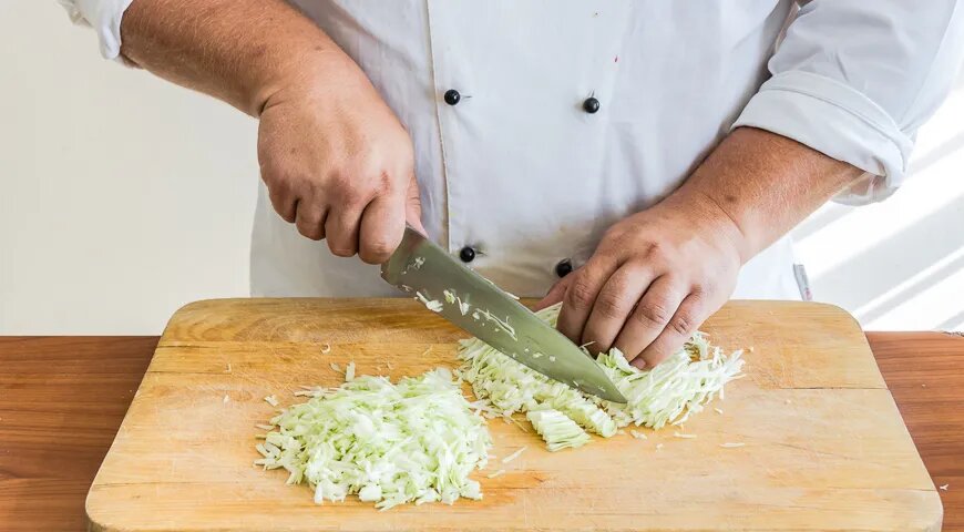 1. Широким ножом нарезать капусту на тонкие полоски, избегая кочерыжки. Затем нарезать ее поперек на кусочки размером около 1,5 см.