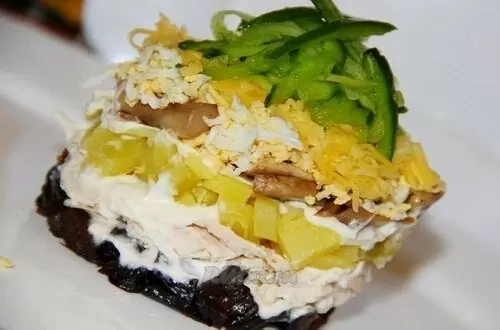 В разъемную форму выкладывайте ингредиенты в следующем порядке: сначала чернослив, нарезанный средними кусочками, затем отварную куриную грудку, порезанную на кубики. Каждый слой обильно смазывайте майонезом.