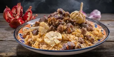 История: Этот плов считается эталоном узбекской кухни, который чаще всего готовят на свадьбах и праздниках. Его основная особенность — богатый цвет и обилие масла, а зира придаёт уникальный аромат.