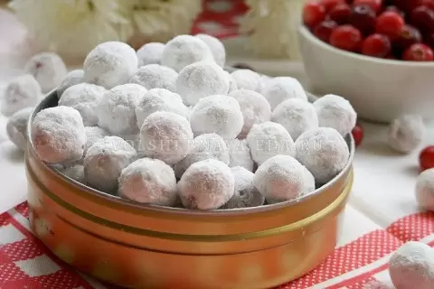 Ягоды помещаются в миску с белком, и их нужно тщательно перемешать так, чтобы каждая клюква была обрамлена в «белковую защиту». После этого, их следует выложить на блюдо, посыпанное сахарной пудрой, и обкатать в ней.