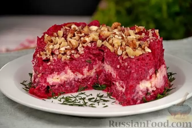 - Салат из свёклы с плавленым сыром и яйцами. Нежные слои свёклы, обогащённые кремовой текстурой сырной смеси и яичной начинкой, делают это блюдо ярким акцентом на столе.
