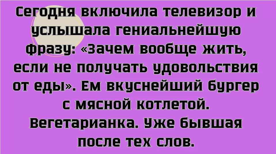 Недавно произошел случай, когда человеку поставили диагноз, требующий строгой диеты, исключающей морепродукты, сладости и, естественно, мясо. После начала новой диеты и последующих анализов, когда его показатели улучшились, он решил побаловать себя и неописуемая радость от обычной котлеты запомнится ему на всю жизнь.