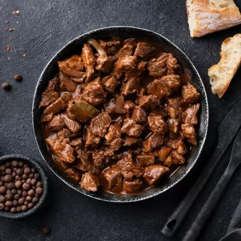 Тушеную говядину можно подавать с любым легким гарниром. Особо хорошо подойдет вареный рис или картофельное пюре, которые прекрасно дополнят это деликатное блюдо. Готовьте с удовольствием!
