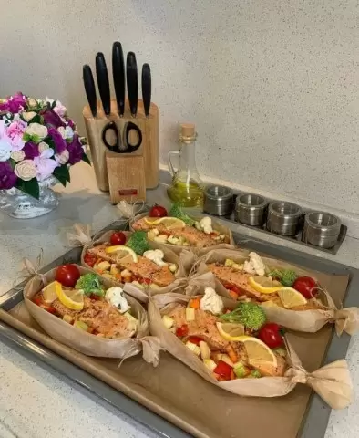 Разложите рыбу и овощи по пергаменту, формируя конверты. Добавьте помидоры черри, брокколи, цветную капусту и дольки лимона. Отправьте всё в разогретую до 180 °C духовку на 45 минут.