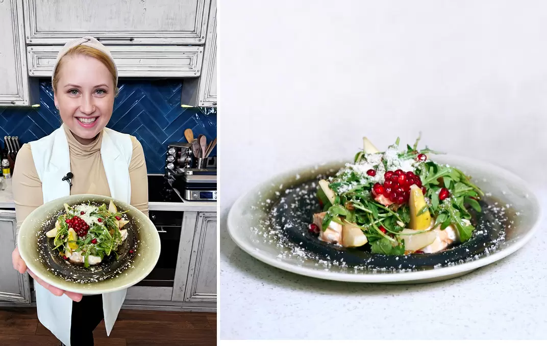 Этот салат — настоящая находка! Он готовится быстро и просто, сочетая в себе свежесть руколы, сладость груши и немного гранатового соуса с творожным сыром.