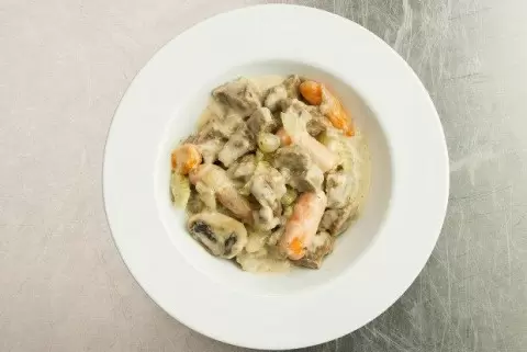 Шаг 3: Теперь пора добавить грибы, очищенные и нарезанные на четвертинки, а также сельдерей, очищенный от волокон и нарезанный маленькими кусочками по 2-3 см. Продолжайте варить до тех пор, пока телятина не станет мягкой и нежной, примерно 20 минут. Не забудьте отварить рис как гарнир.