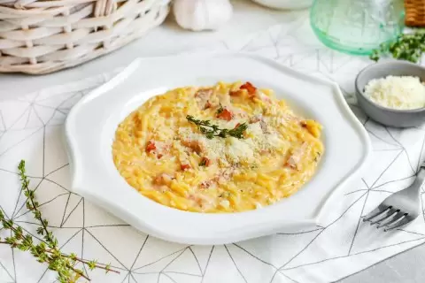 Это новый ракурс на любимое блюдо – орзотто Карбонара, который не оставит равнодушными как приверженцев классики, так и тех, кто ищет что-то необычное. Приятного аппетита!