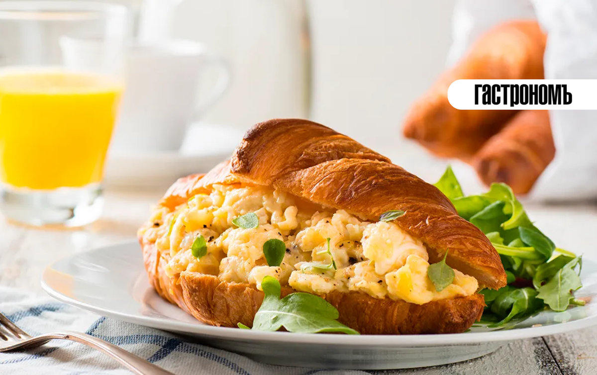 - Популярное решение — круассан с пастрами, хамоном, грюйером и оливковым маслом. Если заменить деликатесное мясо на копченую куриную грудку, получится ни чуть не хуже.