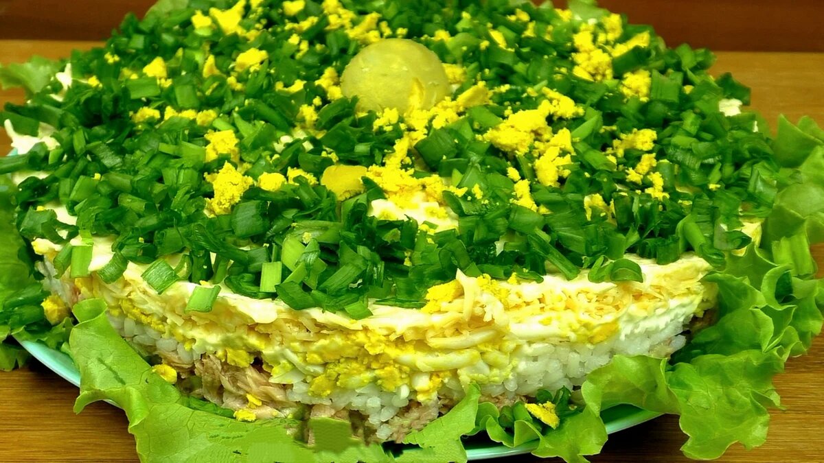 Перед началом нужно отварить и остудить рис. Из яиц убираются 2 желтка, которые пригодятся для украшения. Салат можно собирать в разъёмной форме диаметром 22 см, но это не обязательно.