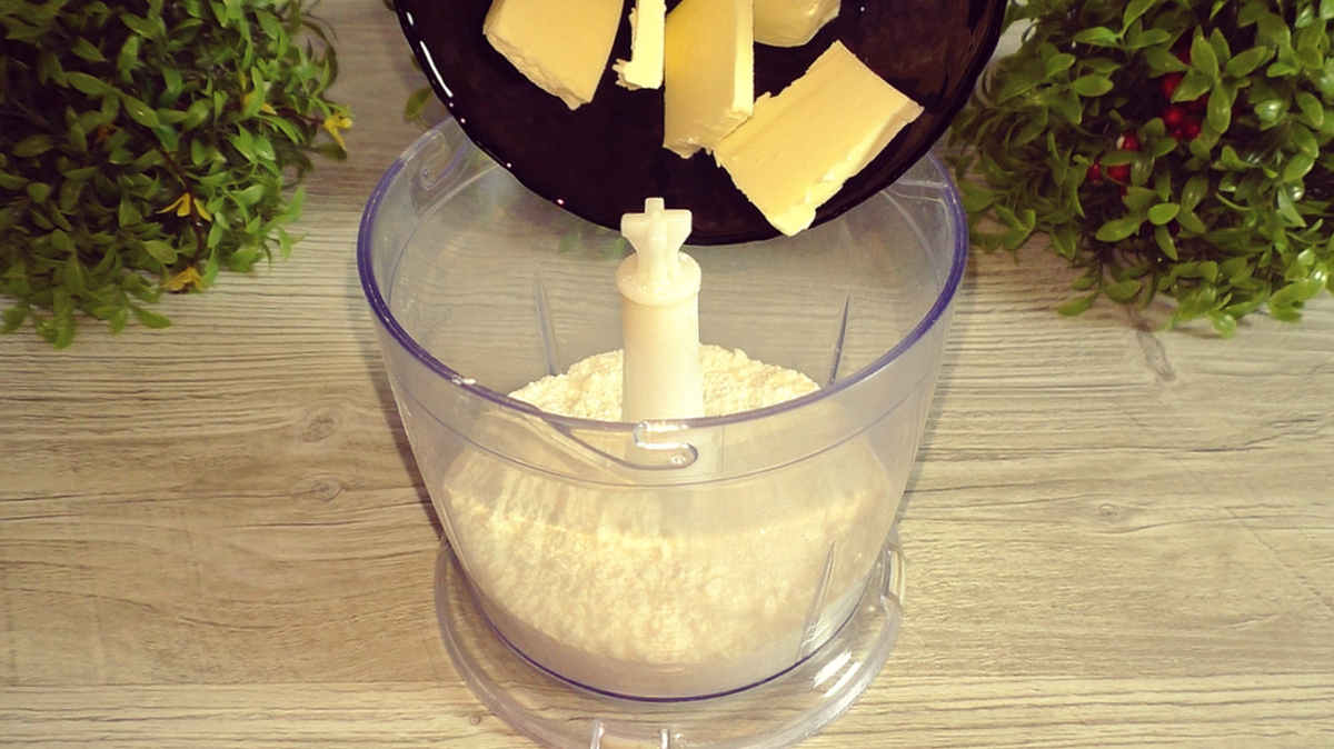 В чаше блендера объединяются мука, сахар и соль. Дополнительно добавляется холодное сливочное масло, нарезанное кубиками, и сметана. Блендер включается на несколько секунд, пока тесто не приобретет однородную текстуру. Это песочное тесто можно избежать использования блендера, если увеличить количество ингредиентов и замесить тесто вручную.